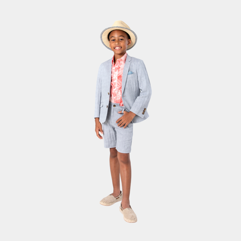 Maak kennis met onze slank gesneden korte broek, perfect voor vakanties en geklede evenementen. Deze short heeft een tropische cabana-streepprint en een verstelbare tailleband aan de binnenkant. Combineer met de Grey Herringbone Sports Jacket!